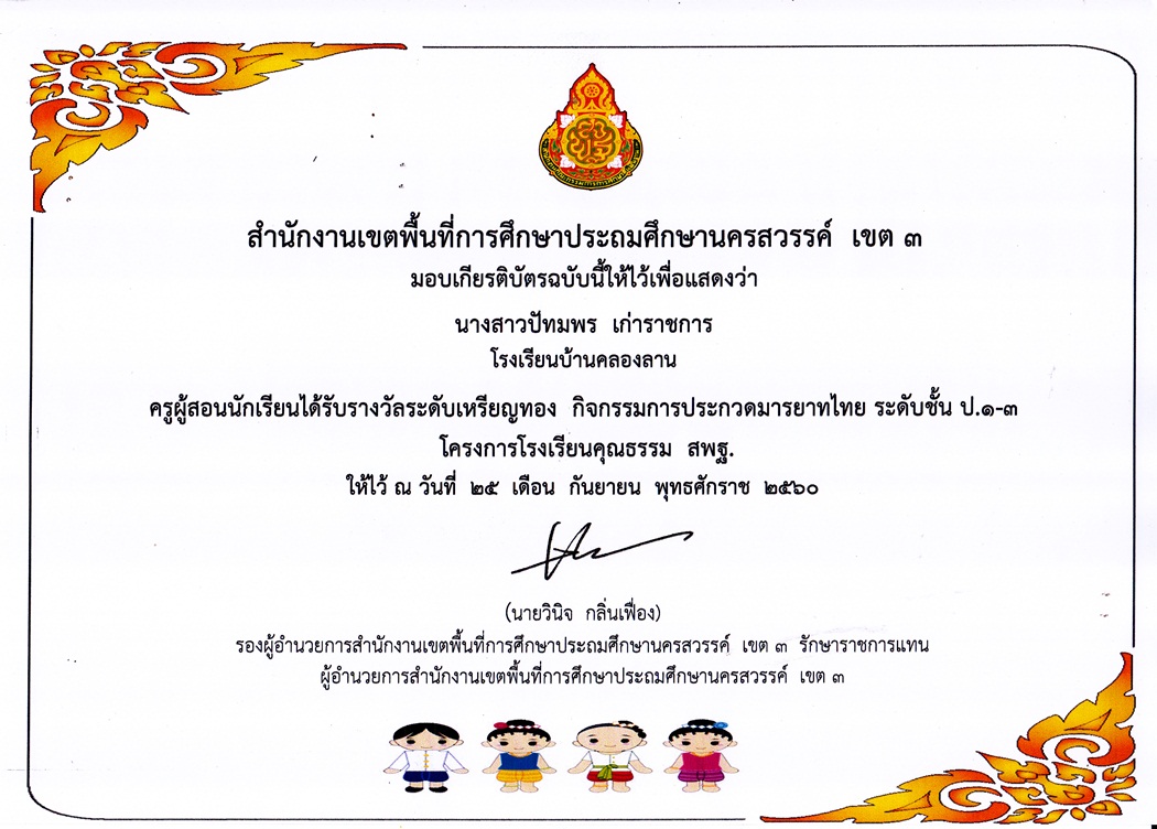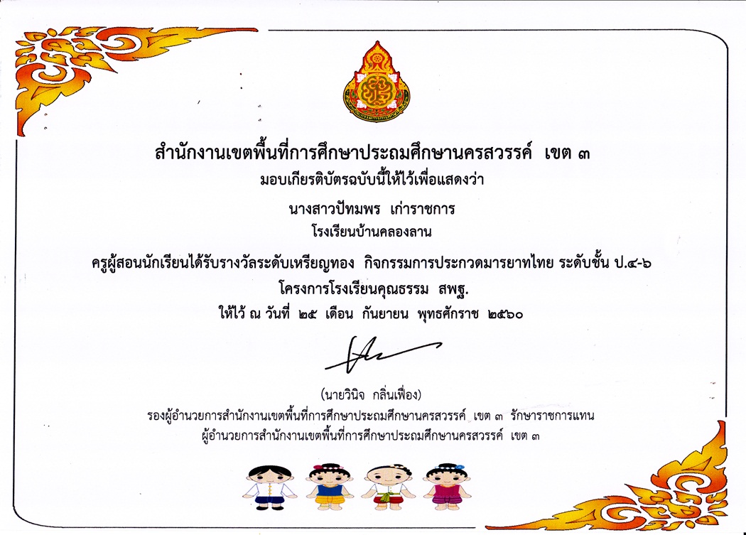 ครูผู้สอนนักเรียนได้รับรางวัลระดับเหรียญทองแดง กิจกรรมการประกวดมารยาทไทย ระดับชั้น ป.1-3 โครงการโรงเรียนคุณธรรม สพฐ