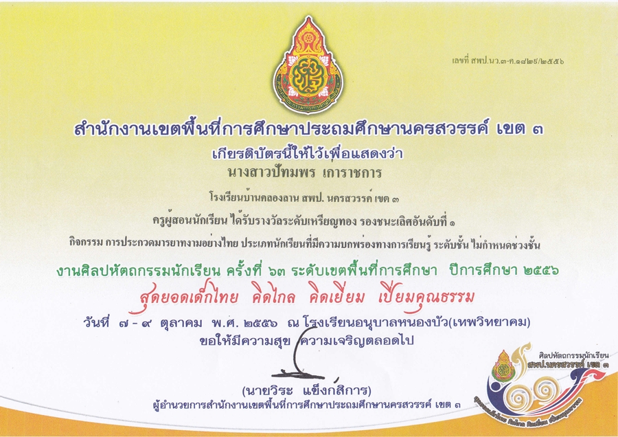 ชื่อผลงาน : ครูผู้สอนนักเรียนได้รับรางวัลระดับเหรียญทอง รองชนะเลิศอันดับที่ 1