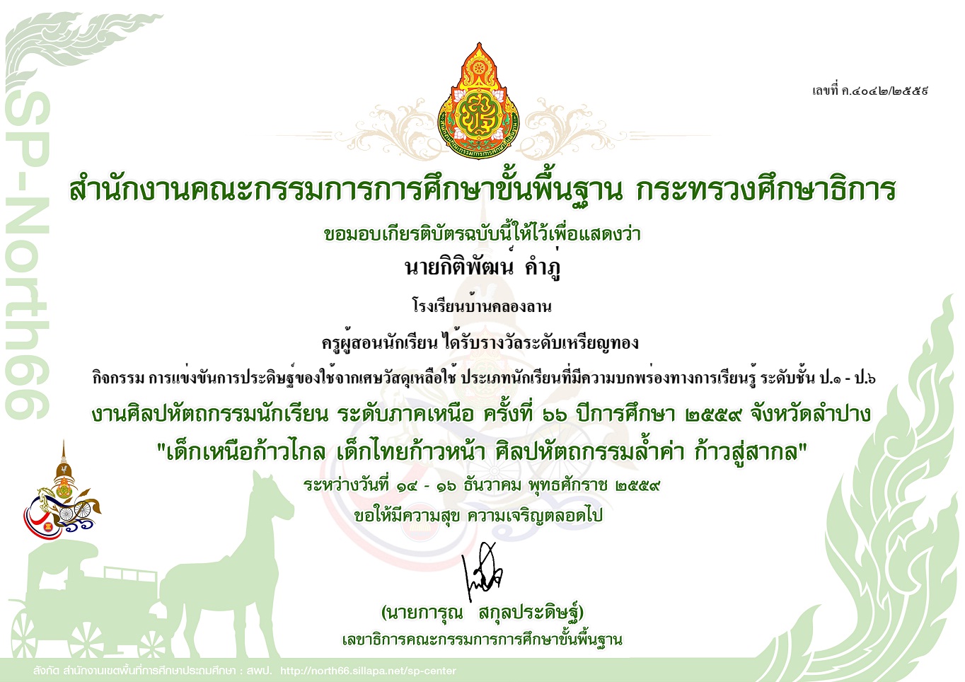 ชื่อผลงาน : ครูผู้สอนนักเรียน ได้รับรางวัลเหรียญทอง กิจกรรมการแข่งขันการประดิษฐ์ของใช้จากเศษวัสดุเหลือใช้ ประเภทนักเรียนที่มีความบกพร่องทางการเรียนรู้ ป.1-ป.6 งานศิลปหัตกรรมนักเรียน ระดับภาคเหนือ ครั้งที่ 66 ปีการศึกษา 2559 จังหวัดลำปาง