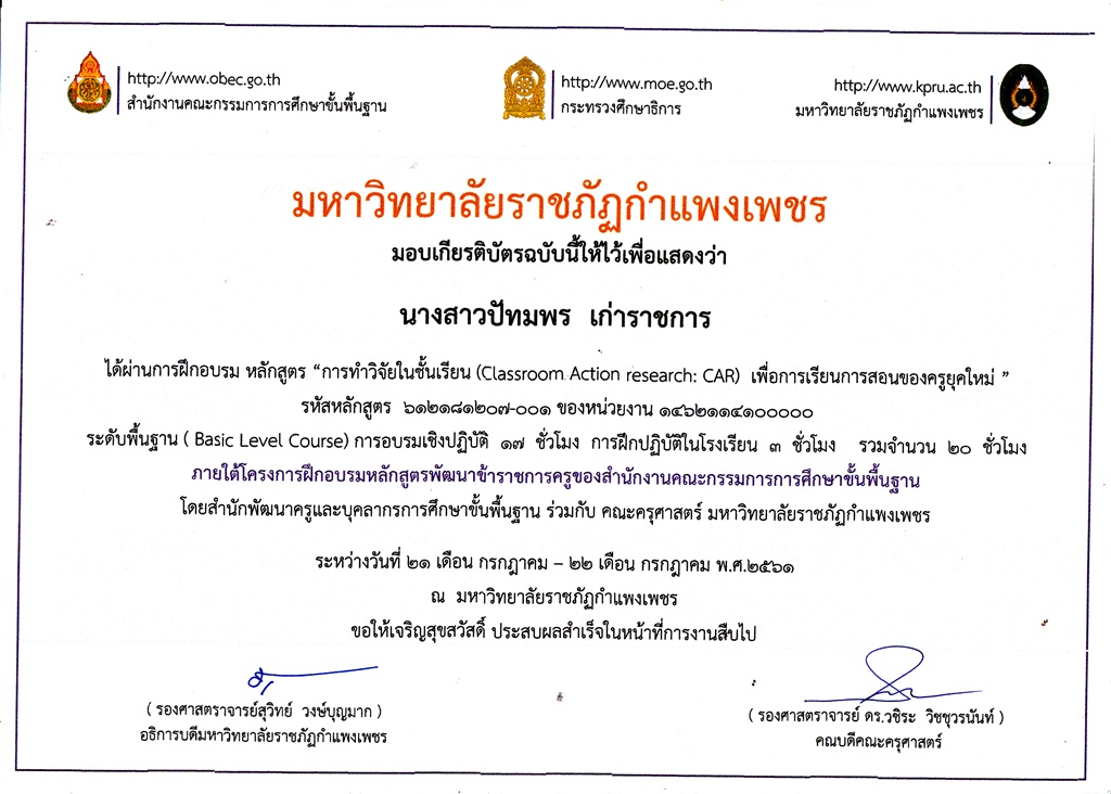 ชื่อผลงาน : ได้ผ่านการอบรมหลักสูตรการทำวิจัยในชั้นเรียน (Classroom Action research:CAR) เพื่อการเรียนการสอนของครูยุคใหม่