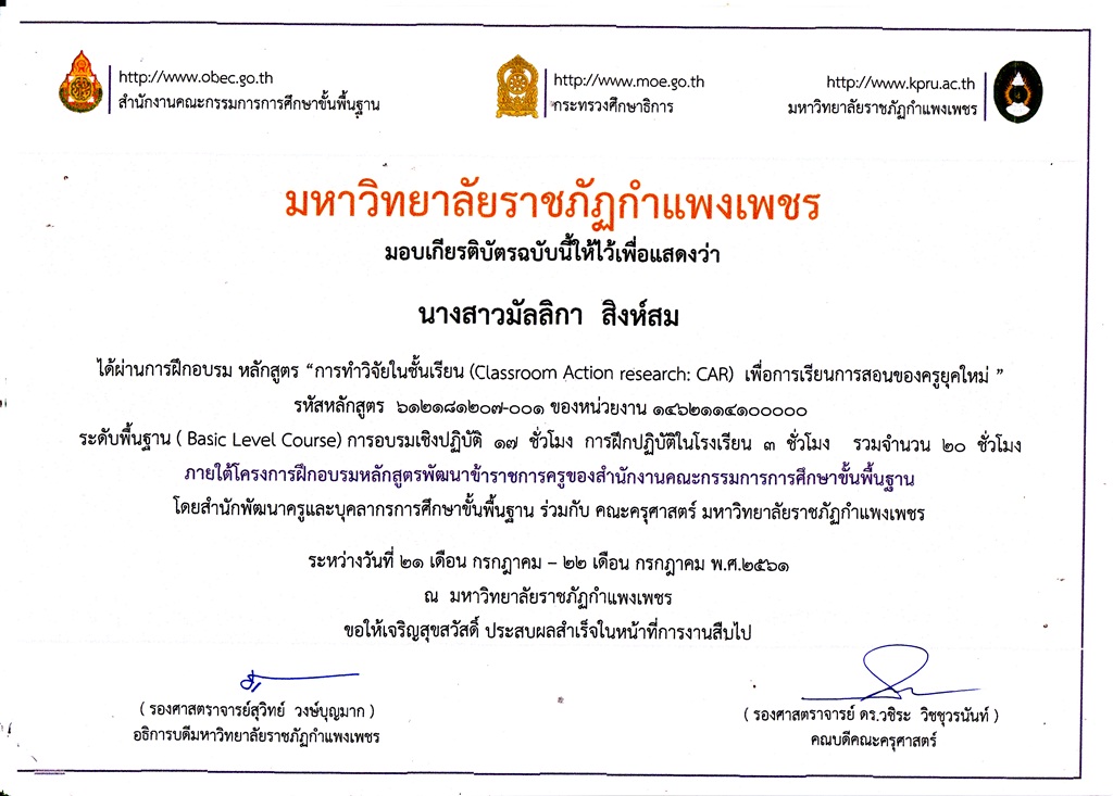 ชื่อผลงาน : ได้ผ่านการอบรมหลักสูตรการทำวิจัยในชั้นเรียน (Classroom Action research:CAR) เพื่อการเรียนการสอนของครูยุคใหม่