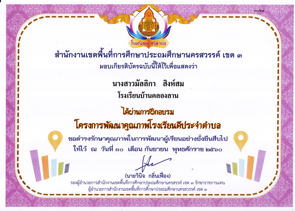 ชื่อผลงาน : ได้ผ่านการฝึกอบรมโครงการพัฒนาคุณภาพโรงเรียนดีประจำตำบล