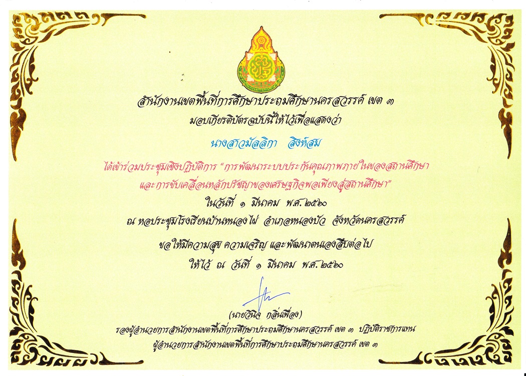 ชื่อผลงาน : ได้เข้าร่วมประชุมเชิงประปฏิบัติการ การพัฒนาระบบประกันคุณภาพภายในของสถานศึกษาและการขับเคลื่อนหลักปรัชญาของเศรษฐกิจพอเพียงสู่สถานศึกษา