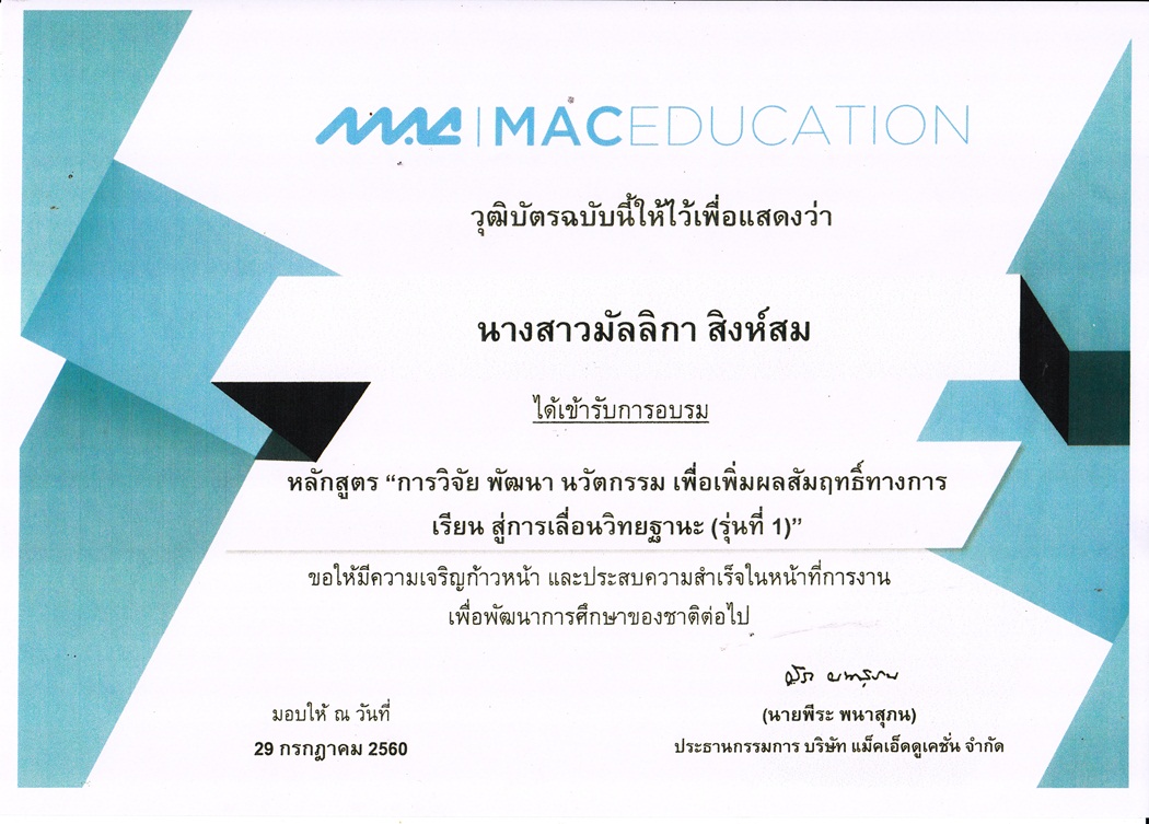 ชื่อผลงาน : ได้เข้ารับการอบรม หลักสูตร การวิจัย พัฒนา นวัตกรรม เพื่อเพิ่มผลสัมฤทธิ์ทางการเรียน สู่การเลื่อนวิทยฐานะ (รุ่นที่ 1)