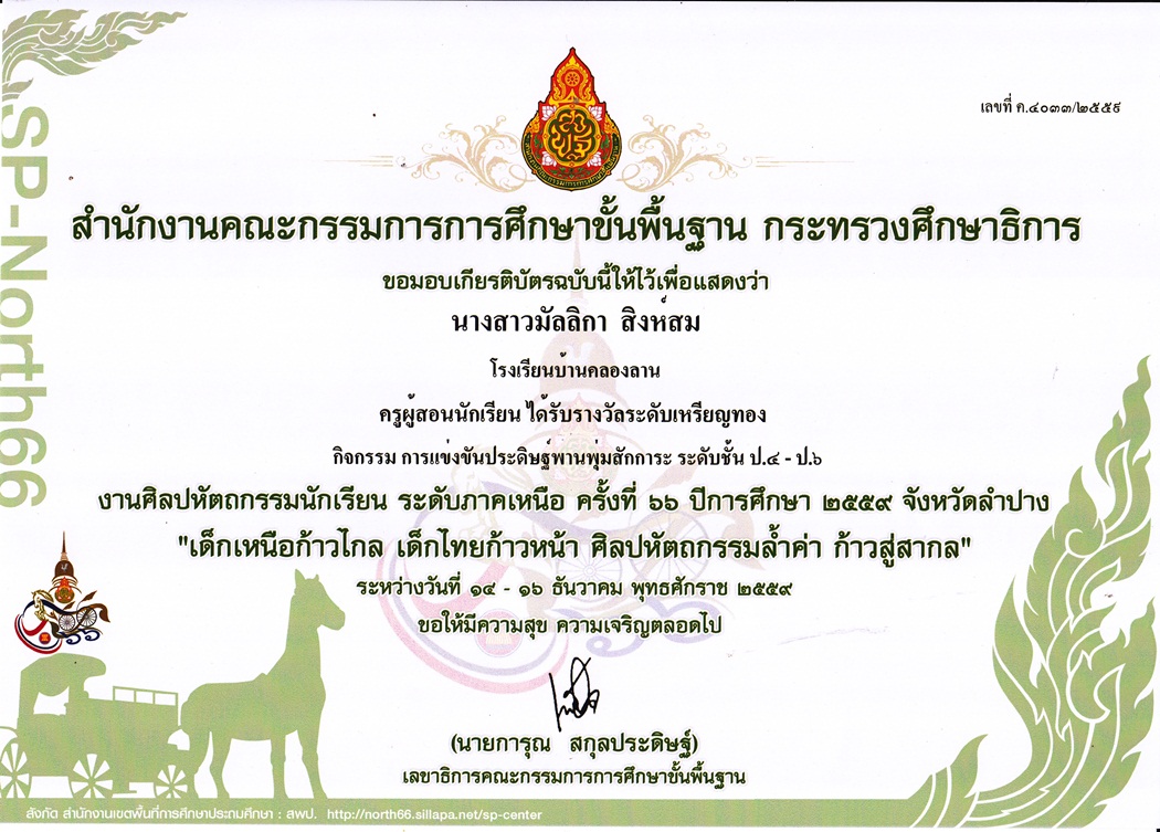 ชื่อผลงาน : ครูผู้สอนนักเรียน ได้รับรางวัลระดับเหรียญทอง กิจกรรมการแข่งขันประดิษฐ์พานพุ่มสักการะ ระดับชั้น ป.4-ป.6งานศิลปหัตถกรรมนักเรียน ระดับภาคเหนือ ครั้งที่ 66 ปีการศึกษา 2559 จังหวัดลำปาง