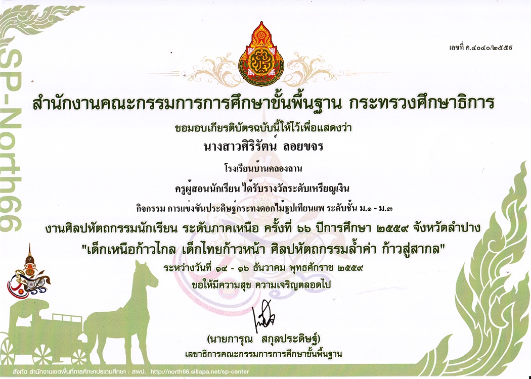 ชื่อผลงาน : ครูผู้สอนนักเรียน ได้รับรางวัลระดับเหรียญเงิน กิจกรรมการแข่งขันประดิษฐ์กระทงดอกไม้ธูปเทียนแพ ระดับชั้น ม.1-ม.3งานศิลปหัตถกรรมนักเรียน ระดับภาคเหนือ ครั้งที่ 66 ปีการศึกษา 2559 จังหวัดลำปาง